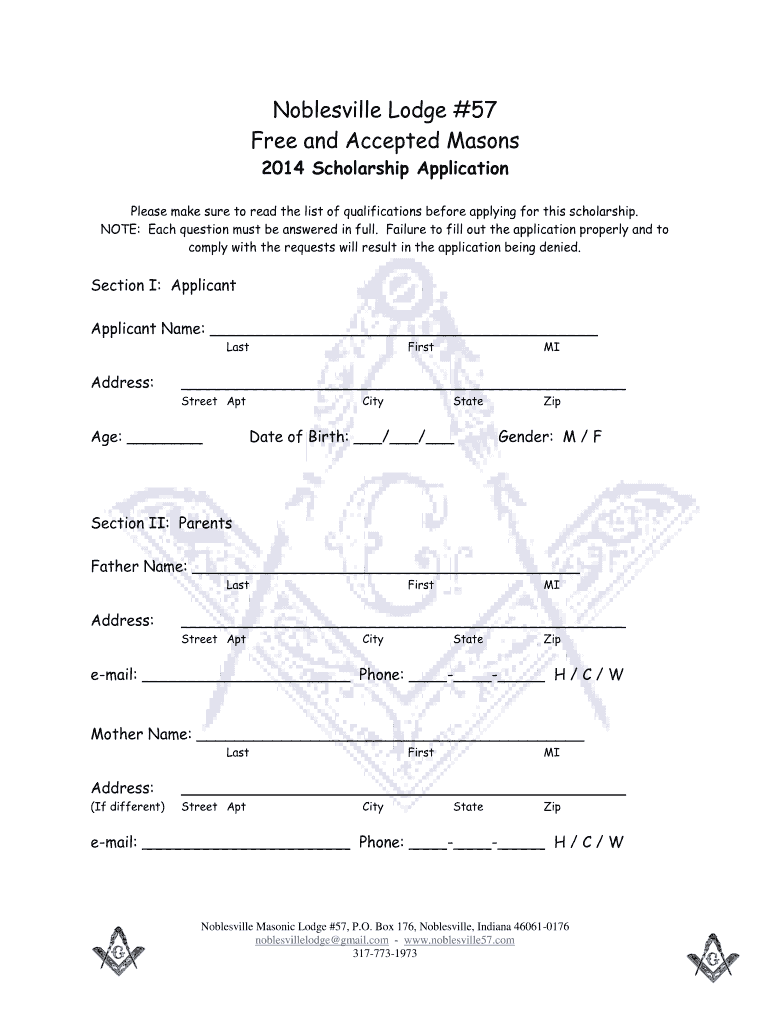 Noblesville Lodge #57 Free and Accepted Masons 2014 Scholarship Who is Eligible? You are eligible to receive a scholarship from Noblesville Lodge #57 if you meet the following criteria: You are a