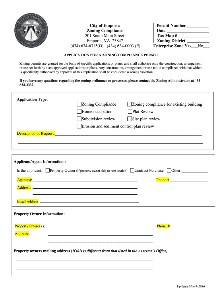 City of Emporia Zoning Compliance 201 South Main Street Emporia, VA 23847 (434) 6346315(O) (434) 6340003 (F) Permit Number Date Tax Map # Zoning District Enterprise Zone Yes No APPLICATION FOR A ZONING