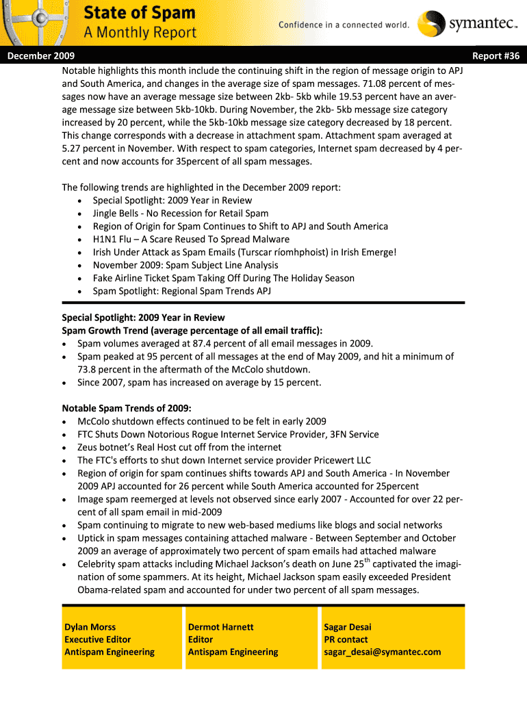 This document provides insights and analysis on spam trends and statistics observed in December 2009, reviewing the regions of origin, the size and categories of spam messages, and notable changes