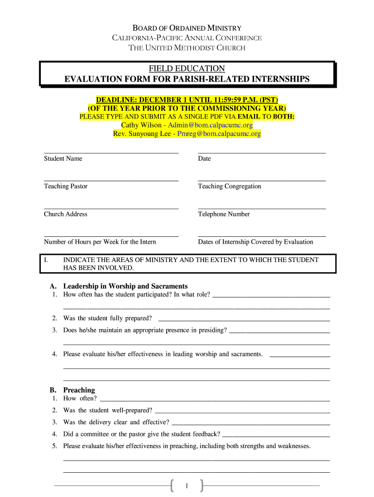 BOARD OF ORDAINED MINISTRY CALIFORNIAPACIFIC ANNUAL CONFERENCE THE UNITED METHODIST CHURCH FIELD EDUCATION EVALUATION FORM FOR PARISHRELATED INTERNSHIPS DEADLINE: DECEMBER 1 UNTIL 11:59:59 P.M. (PST)