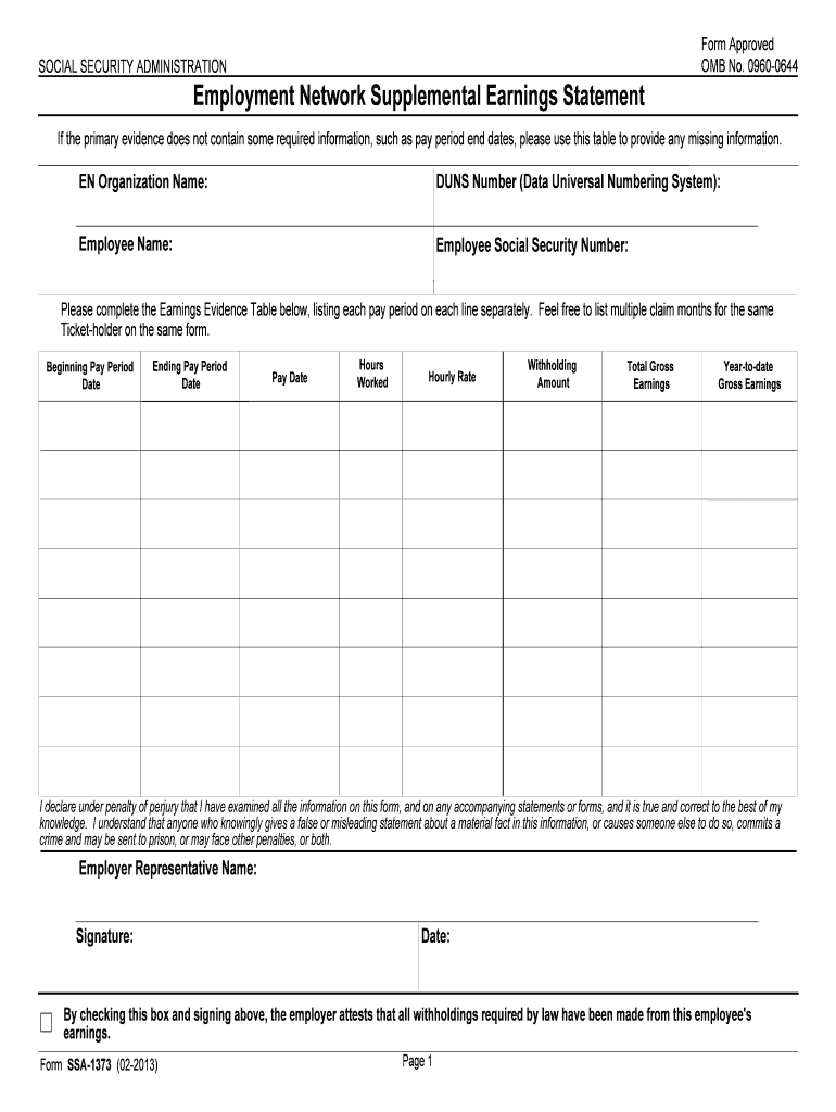SOCIAL SECURITY ADMINISTRATION Employment Network Supplemental Earnings Statement Form Approved OMB No. 09600644 If the primary evidence does not contain some required information, such as pay period