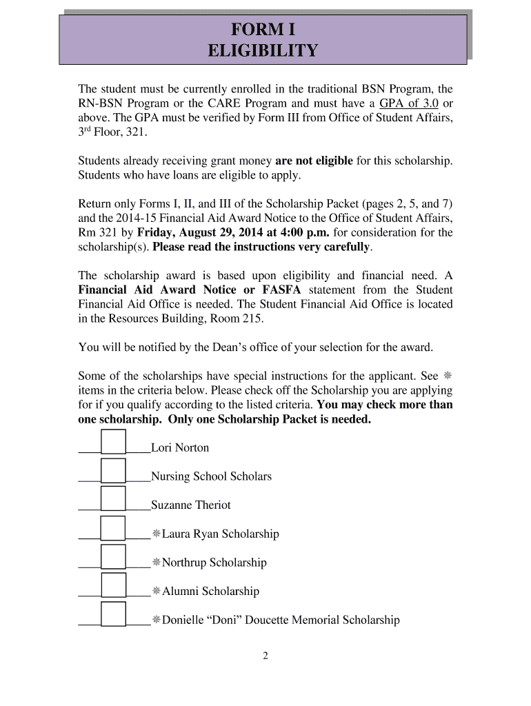 Fall 2014 1 FORM I ELIGIBILITY The student must be currently enrolled in the traditional BSN Program, the RN BSN Program or the CARE Program and must have a GPA of 3.0 or above. The GPA must be verified