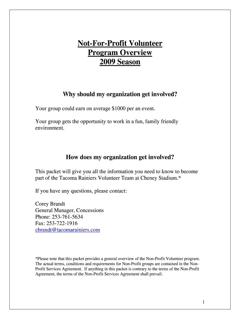 This document provides an overview of the Tacoma Rainiers Volunteer Program, including involvement details, requirements for organizations, event expectations, and contact information for coordination