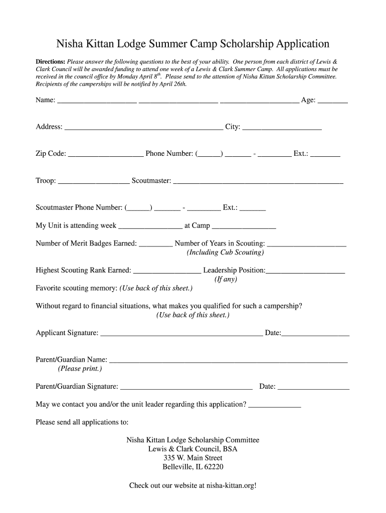 Nisha Kitten Lodge Summer Camp Scholarship Application Directions: Please answer the following questions to the best of your ability. One person from each district of Lewis & Clark Council will be