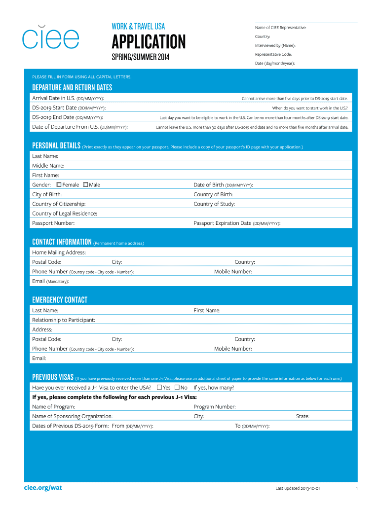 WORK & TRAVEL USA Name of CITE Representative: APPLICATION Country: Interviewed by (Name): SPRING/SUMMER 2014 Representative Code: Date (day/month/year): PLEASE FILL IN FORM USING ALL CAPITAL LETTERS.