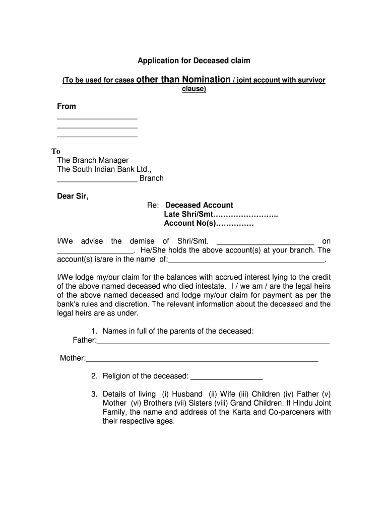 The Deceased Account Claim Application is a formal document used by legal heirs to claim the balance and accrued interest of a deceased account holder from The South Indian Bank Ltd.