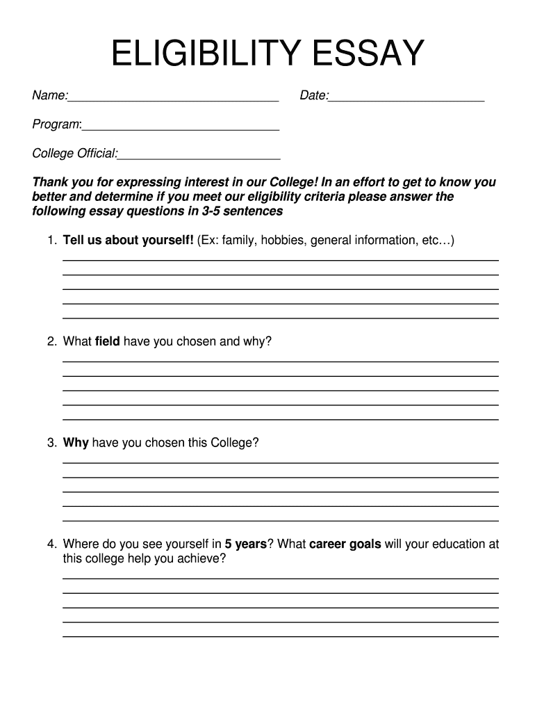 ELIGIBILITY ESSAY Name: Date: Program: College Official: Thank you for expressing interest in our College! In an effort to get to know you better and determine if you meet our eligibility criteria