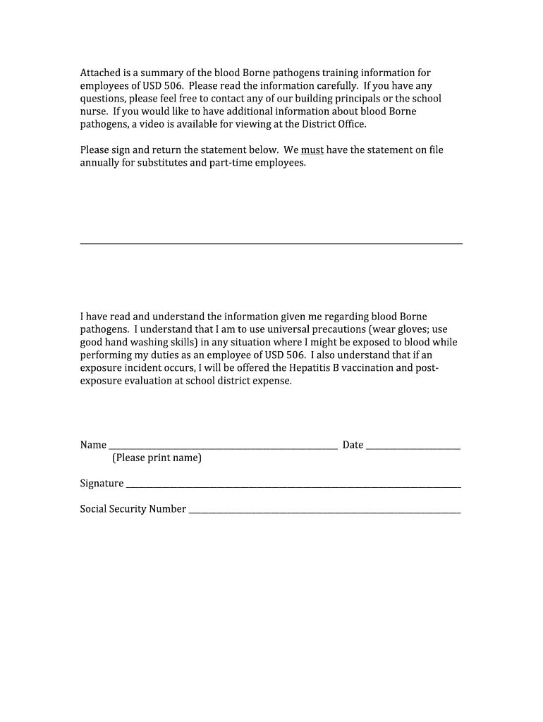 Attached is a summary of the blood-borne pathogens training information for employees of USD 506. Please read the information carefully. If you have any questions, please feel free to contact any