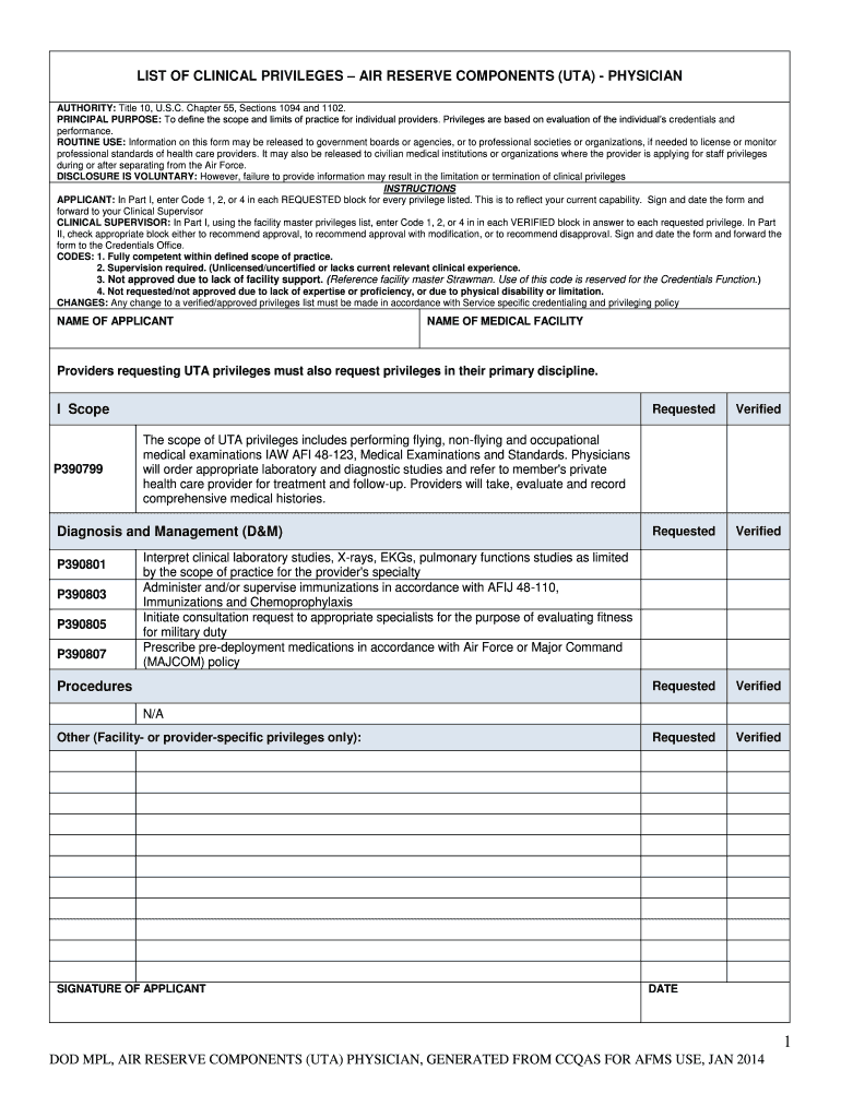 LIST OF CLINICAL PRIVILEGES AIR RESERVE COMPONENTS (UTA) PHYSICIAN AUTHORITY: Title 10, U.S.C. Chapter 55, Sections 1094 and 1102. PRINCIPAL PURPOSE: To define the scope and limits of practice for