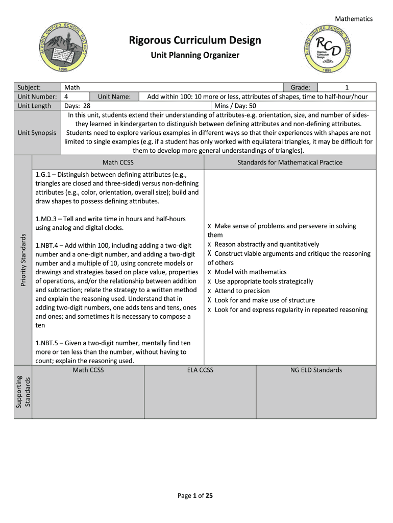 Mathematics Rigorous Curriculum Design Unit Planning Organizer Subject: Unit Number: Unit Length Unit Synopsis Math Grade: 1 4 Unit Names: Add within 100: 10 more or less, attributes of shapes, time