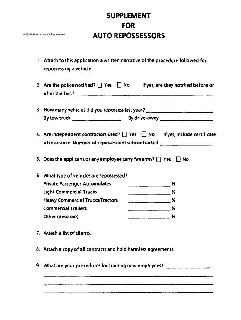 This document serves as an application supplement for auto repossessors, requiring information on procedures, vehicle repossession statistics, and operational details such as notifications to police,