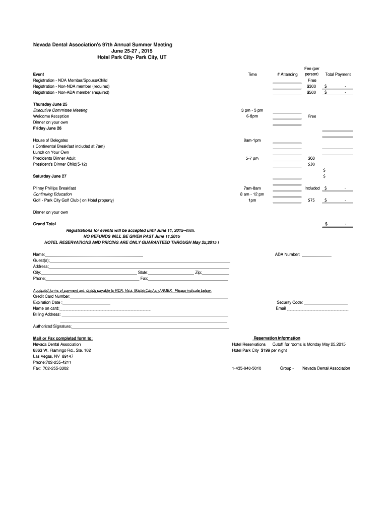 Nevada Dental Association's 97th Annual Summer Meeting June 2527, 2015 Hotel Park City, UT Event Registration NDA Member/Spouse/Child Registration Honda member (required) Registration NonADA member