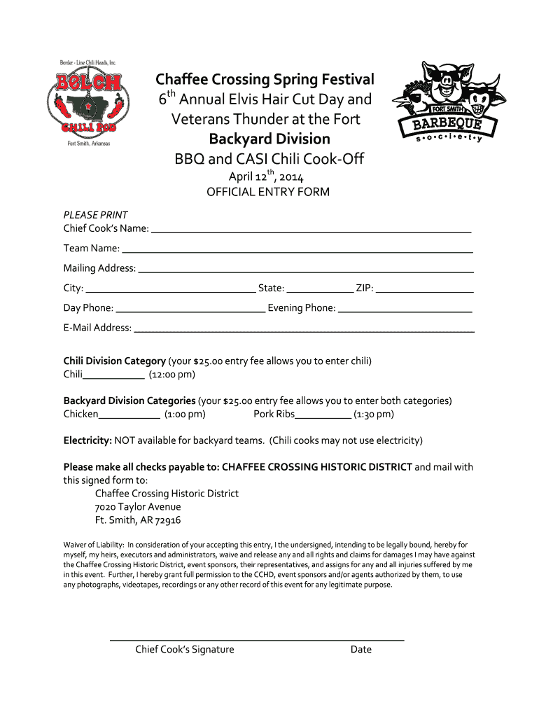 Chaffee Crossing Spring Festival 6th Annual Elvis Hair Cut Day and Veterans Thunder at the Fort Backyard Division BBQ and CASE Chili Cookout April 12th, 2014 OFFICIAL ENTRY FORM PLEASE PRINT Chief