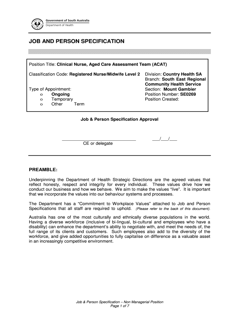JOB AND PERSON SPECIFICATION Position Title: Clinical Nurse, Aged Care Assessment Team (ACAT) Classification Code: Registered Nurse/Midwife Level 2 Type of Appointment: o Ongoing o Temporary o Other