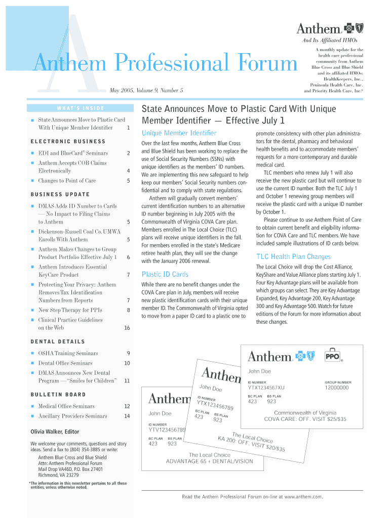 A monthly update for the health care professional community from Anthem Blue Cross and Blue Shield, detailing changes in policies, new products, seminars, and updates on electronic claims processing