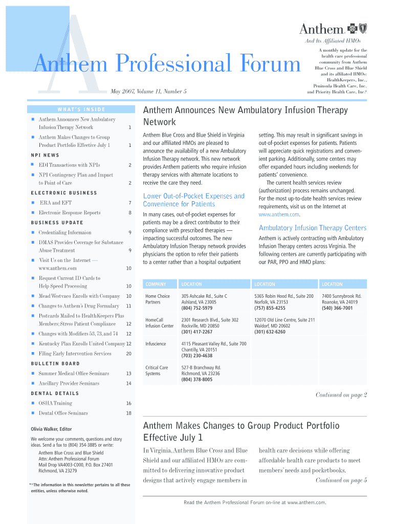 A monthly update for the health care professional community from Anthem Blue Cross and Blue Shield covering new product announcements, health services reviews, changes in formularies, and educational