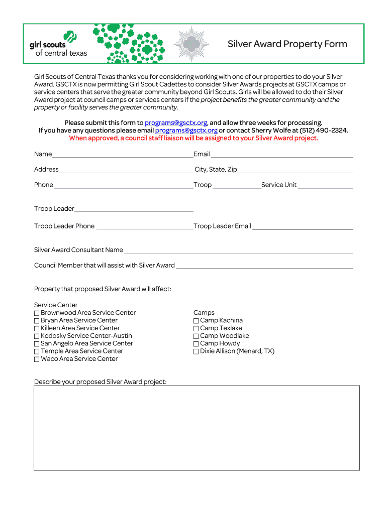 Girl Scouts who are pursuing the gsctx silver award need the gsctx silver award property form.