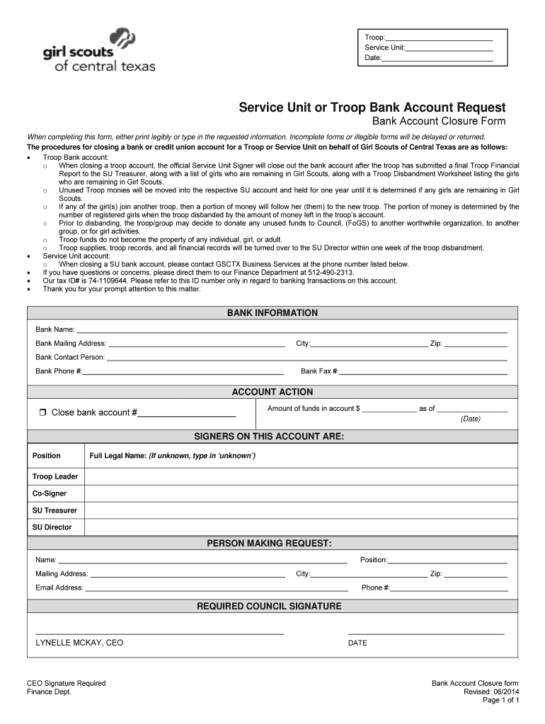 Troop: Service Unit: Date: Service Unit or Troop Bank Account Request Bank Account Closure Form When completing this form, either print legibly or type in the requested information. Incomplete forms