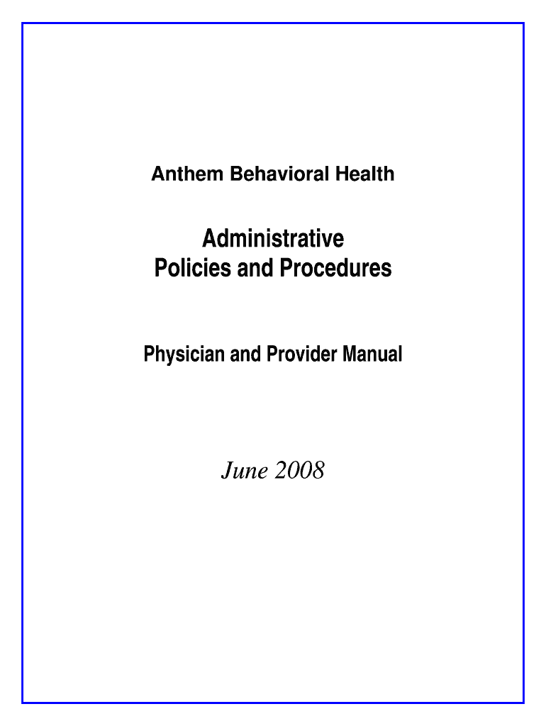 This manual provides important information concerning the policies and procedures for individual physicians, practitioners, group practices, service programs and facilities related to Anthem Behavioral