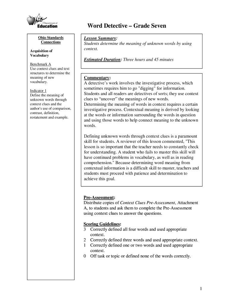 Word Detective Grade Seven Ohio Standards Connections Acquisition of Vocabulary Lesson Summary: Students determine the meaning of unknown words by using context. Estimated Duration: Three hours and