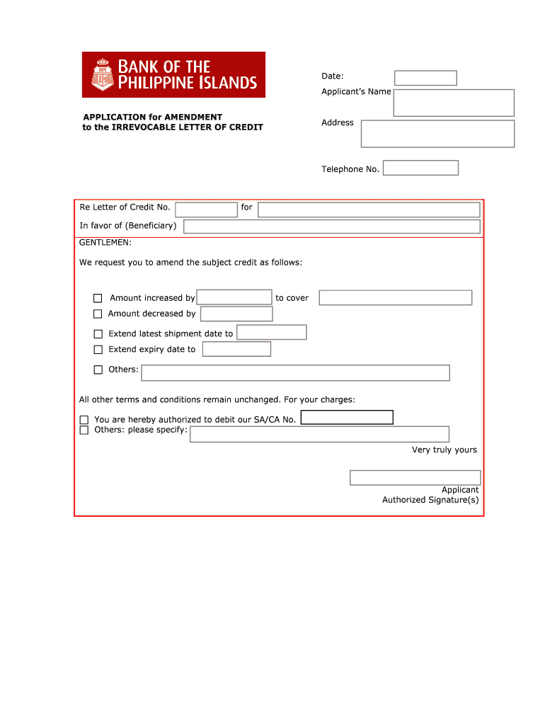 APPLICATION for AMENDMENT to the IRREVOCABLE LETTER OF Candidate: Applicant s Name Address Telephone No. Re Letter of Credit No. for ...