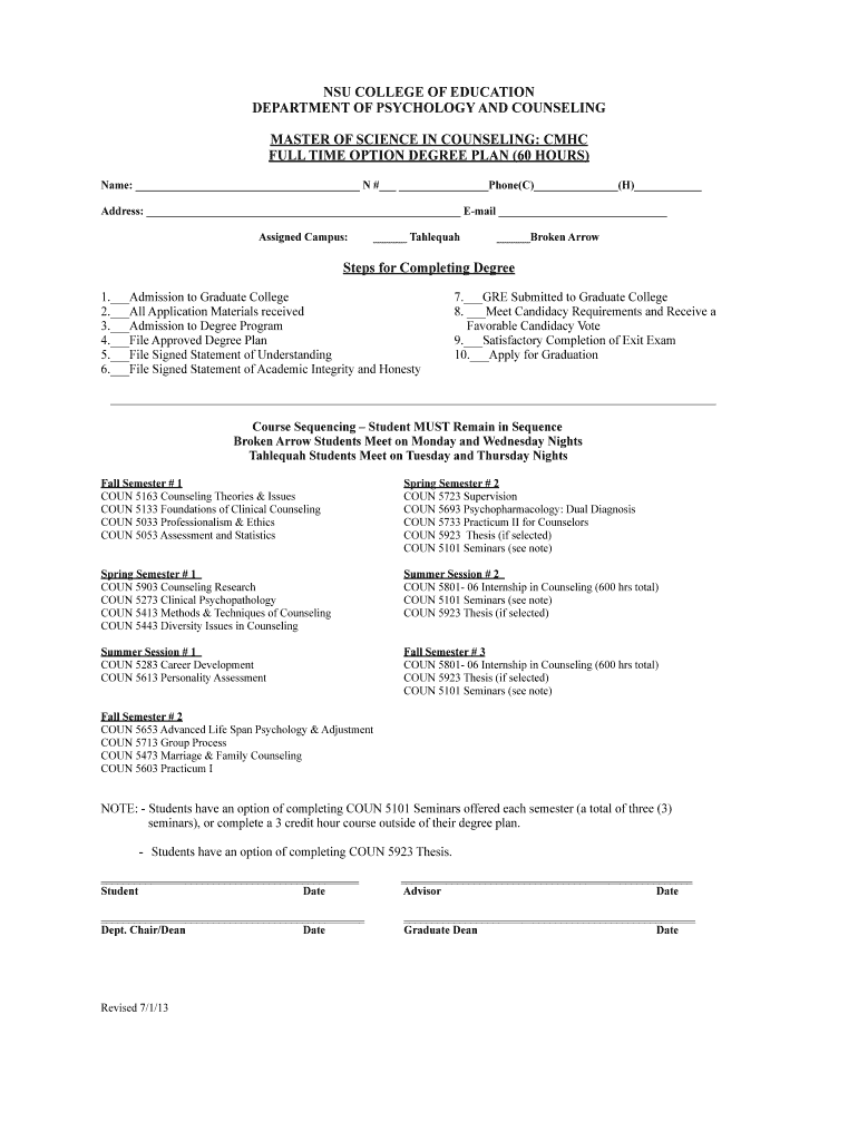 NSU COLLEGE OF EDUCATION DEPARTMENT OF PSYCHOLOGY AND COUNSELING MASTER OF SCIENCE IN COUNSELING: MHC FULL TIME OPTION DEGREE PLAN (60 HOURS) Name: N # Phone(C) (H) Address: Email Assigned Campus: