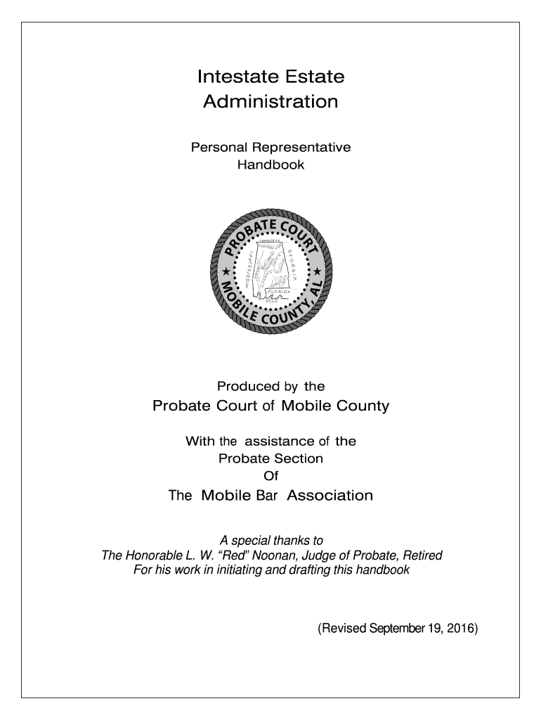 This handbook is intended for Personal Representatives and Attorneys involved in administering an estate where the decedent died without a will in Alabama.