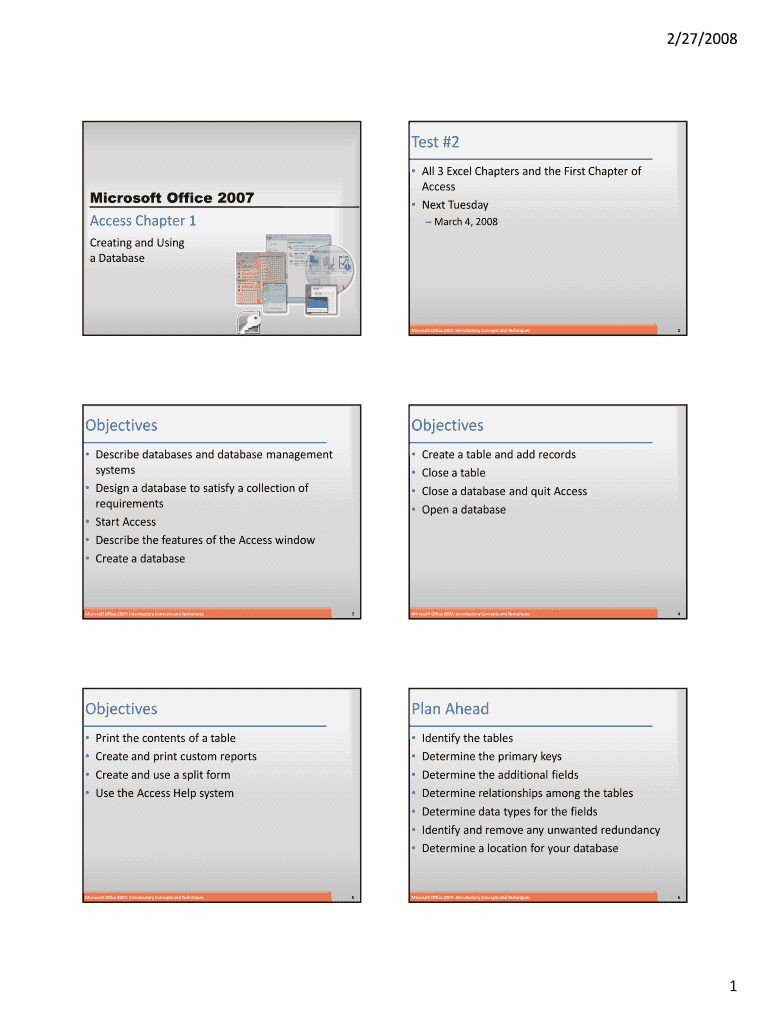 2/27/2008 Test #2 All 3 Excel Chapters and the First Chapter of Access Next Tuesday Microsoft Office 2007 Access Chapter 1 March 4, 2008, Creating and Using a Database Microsoft Office 2007: Introductory