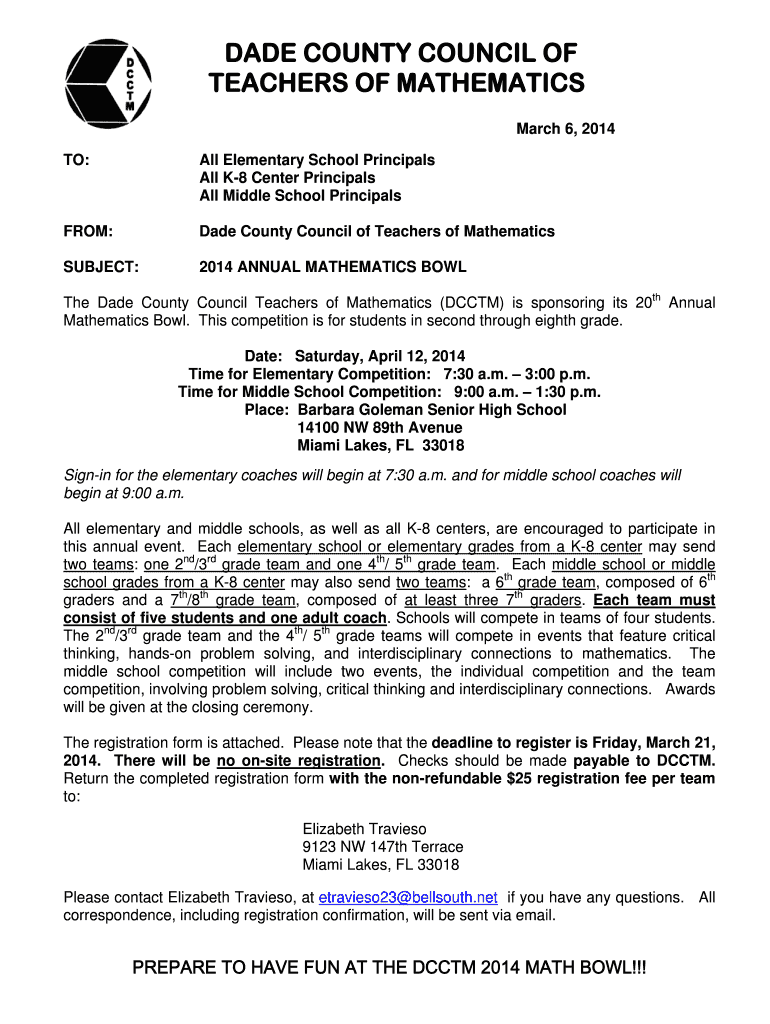 DADE COUNTY COUNCIL OF TEACHERS OF MATHEMATICS March 6, 2014, TO: All Elementary School Principals All K8 Center Principals All Middle School Principals FROM: Dade County Council of Teachers of Mathematics