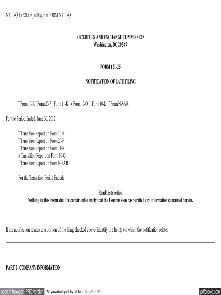 nt 10-q 1 v321538 is a non-timely filing notification for quarterly reports filed with the Securities and Exchange Commission (SEC).