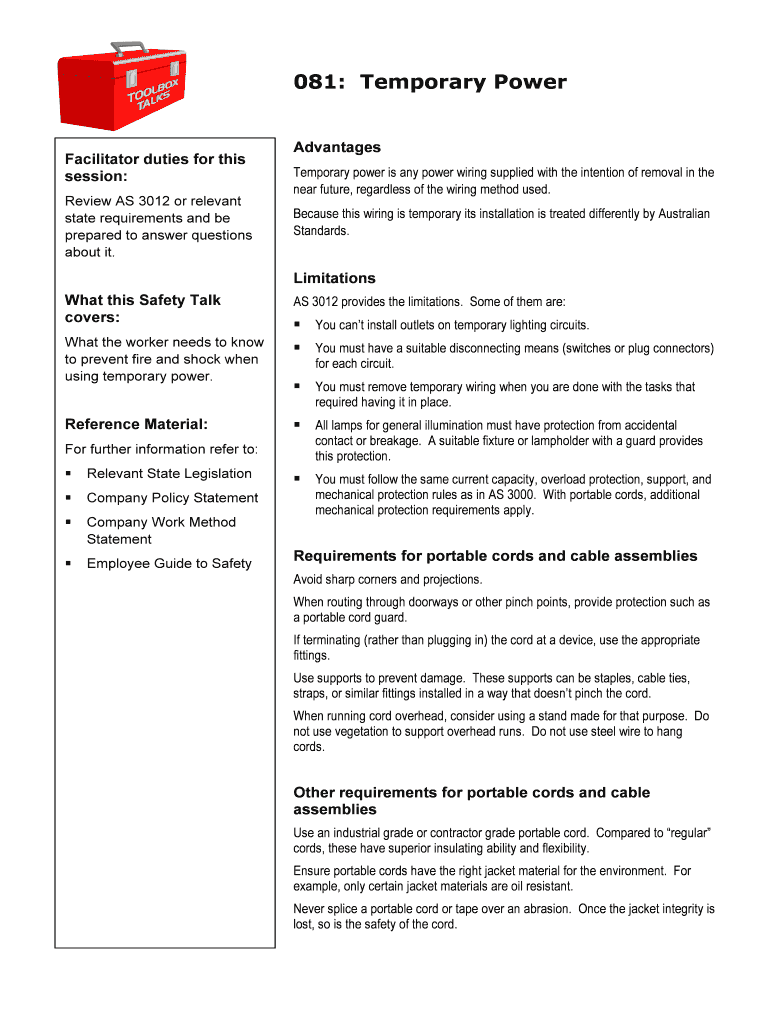 081: Temporary Power Facilitator duties for this session: Review AS 3012 or relevant state requirements and be prepared to answer questions about it. Advantages Temporary power is any power wiring