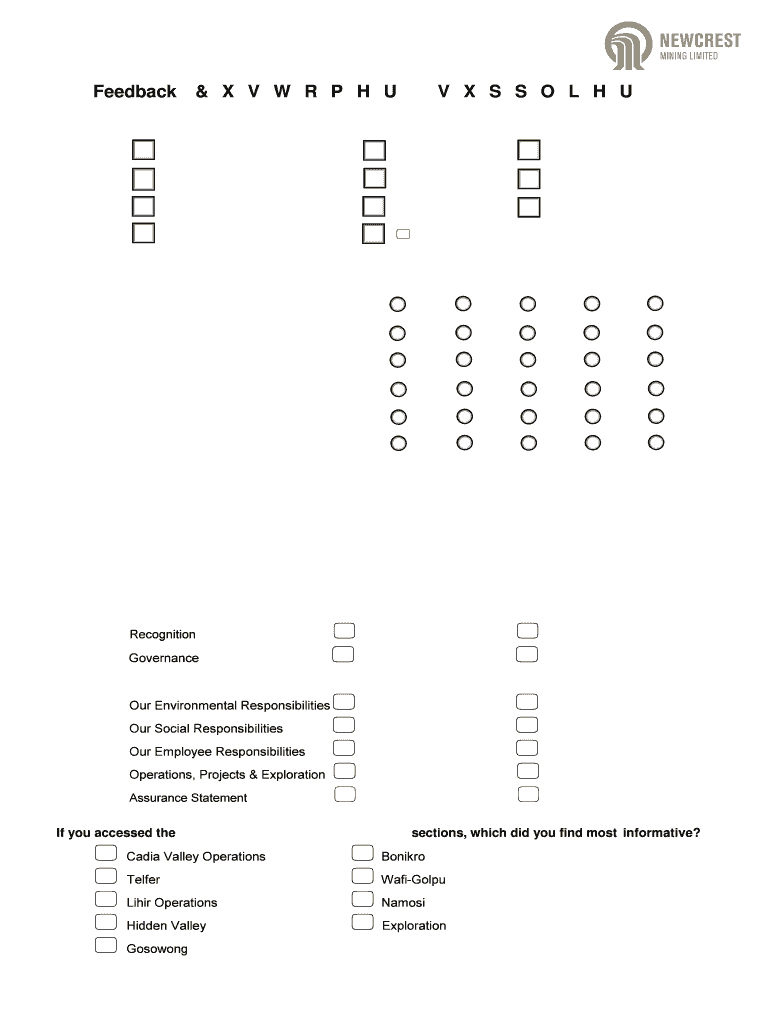 Feedback)RUPNewcrest Sustainability Report FY201 6XSSRUWLQJ 'RFXPHQWV Which did you access? Which was most useful? GRI G3 Content Index.