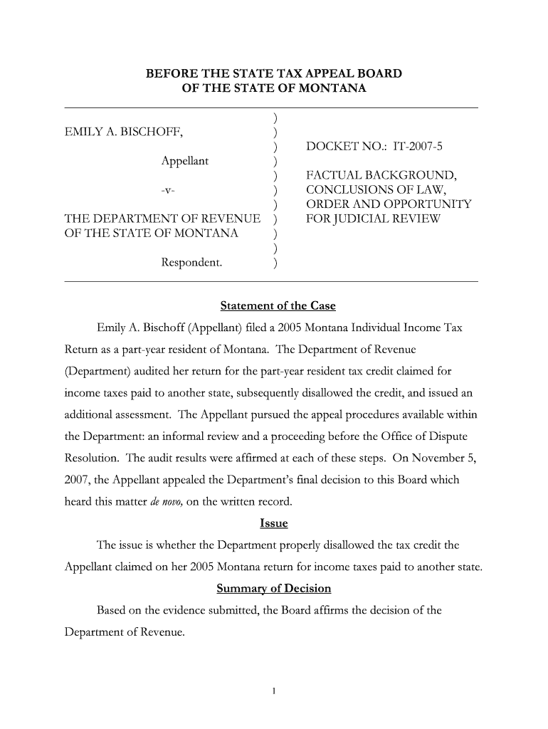 BEFORE THE STATE TAX APPEAL BOARD OF THE STATE OF MONTANA) EMILY A. BISHOP, ) ) DOCKET NO.: IT20075 Appellant)) FACTUAL BACKGROUND, v) CONCLUSIONS OF LAW,) ORDER AND OPPORTUNITY THE DEPARTMENT OF