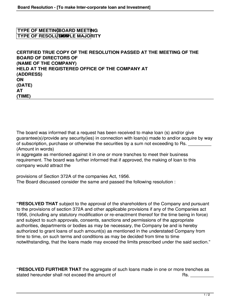 Get the free Board Resolution - To make Inter-corporate loan and Investment