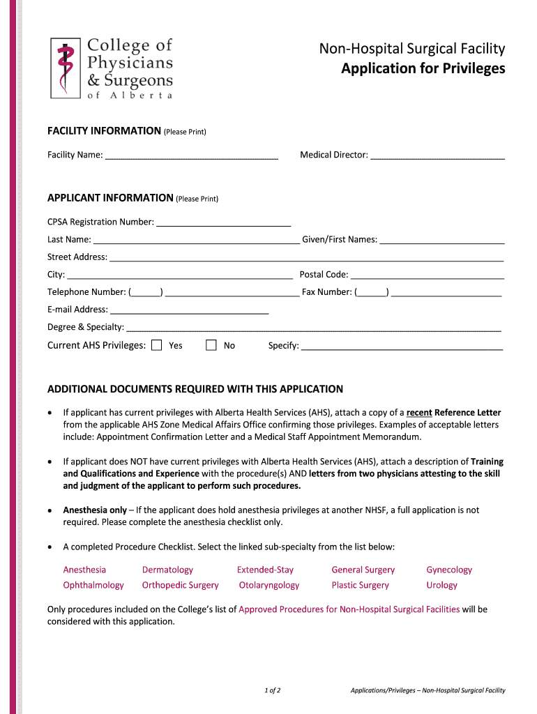 Hospital Surgical Facility Application for Privileges FACILITY INFORMATION (Please Print) Facility Name: Medical Director: APPLICANT INFORMATION (Please Print) CPA Registration Number: Last Name: