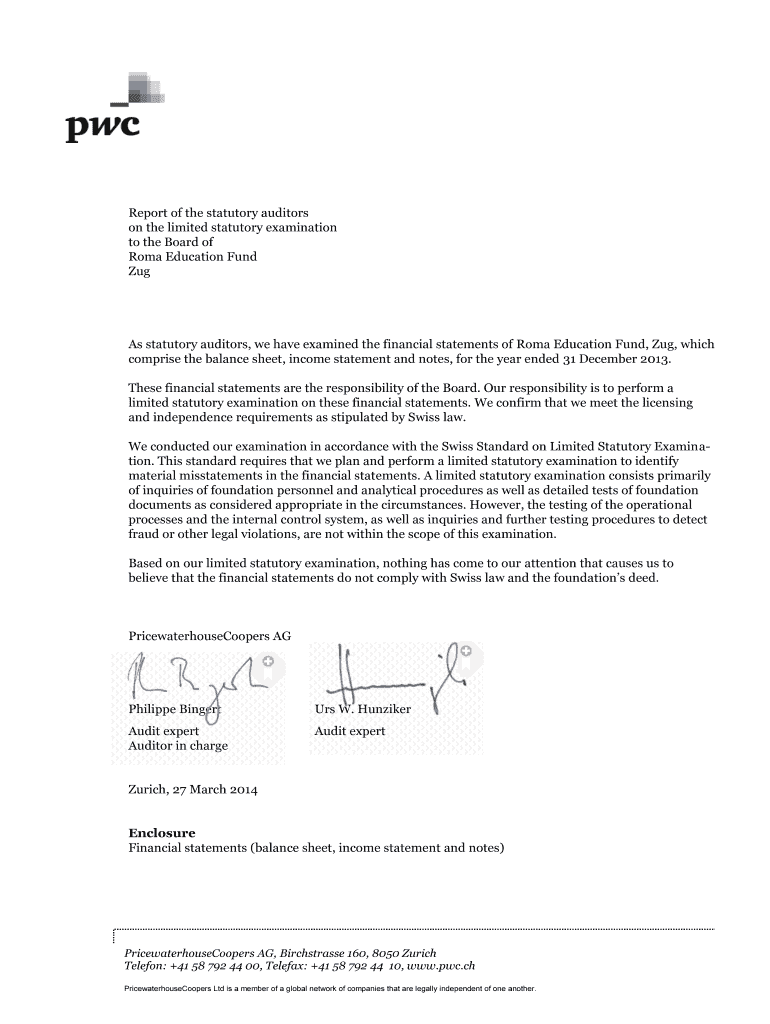 Roma Education Fund Zug Report of the statutory auditors to the Board on the financial statements 2013 Report of the statutory auditors on the limited statutory examination to the Board of Roma Education