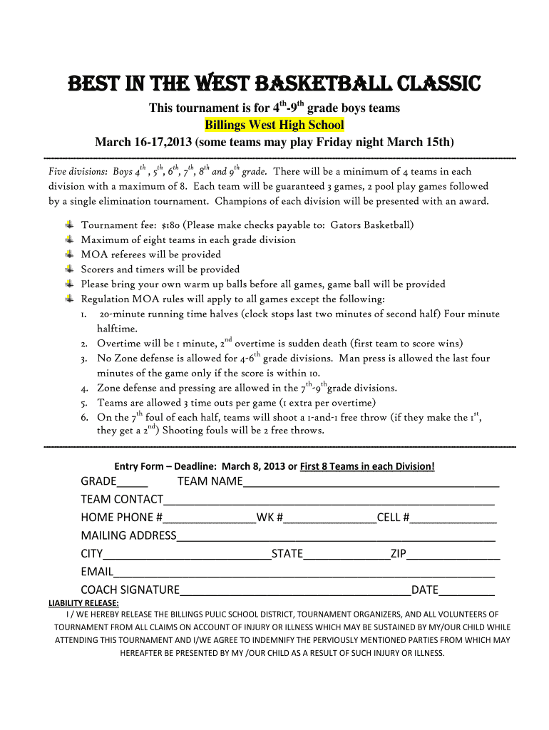 This document serves as an entry form for the Best in the West Basketball Classic tournament, detailing information regarding the tournament, rules, entry requirements, and liability release.