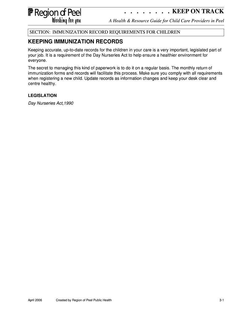 . . . . . . . . KEEP ON TRACK A Health & Resource Guide for Child Care Providers in Peel SECTION: IMMUNIZATION RECORD REQUIREMENTS FOR CHILDREN KEEPING IMMUNIZATION RECORDS Keeping accurate, update