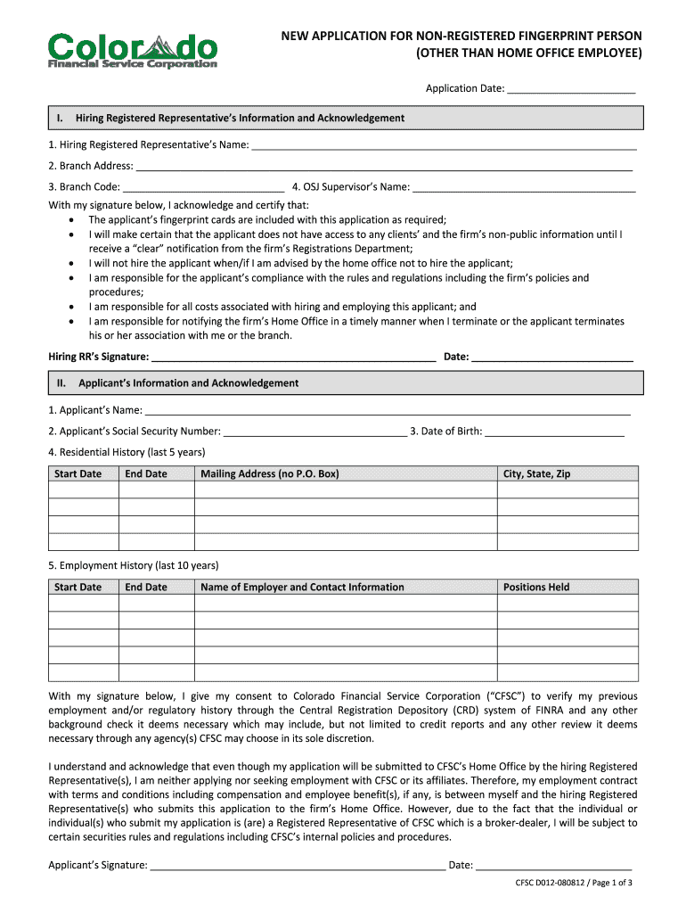 This document is an application form for hiring a non-registered fingerprint person at Colorado Financial Service Corporation, including necessary acknowledgements from both the hiring representative