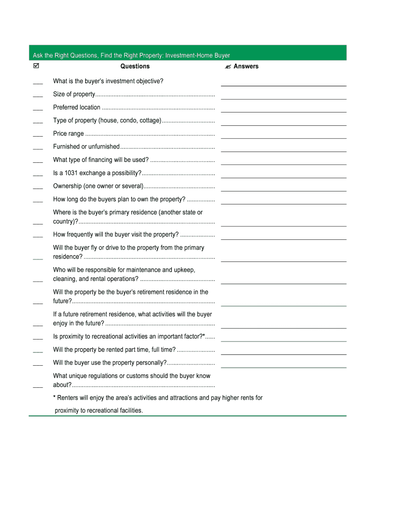 Ask the Right Questions, Find the Right Property: InvestmentHome Buyer Questions What is the buyers' investment objective? Size of property........................................................................