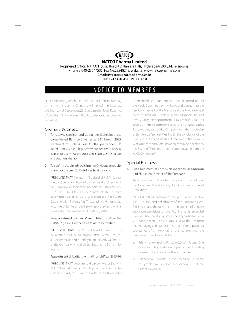NATO Pharma Limited Registered Office: NATO House, Road # 2, Barbara Hills, Hyderabad500 034, Telangana Phone # 04023547532, Fax No.23548243, website: www.natcopharma.co.in Email: investors natcopharma.co.in