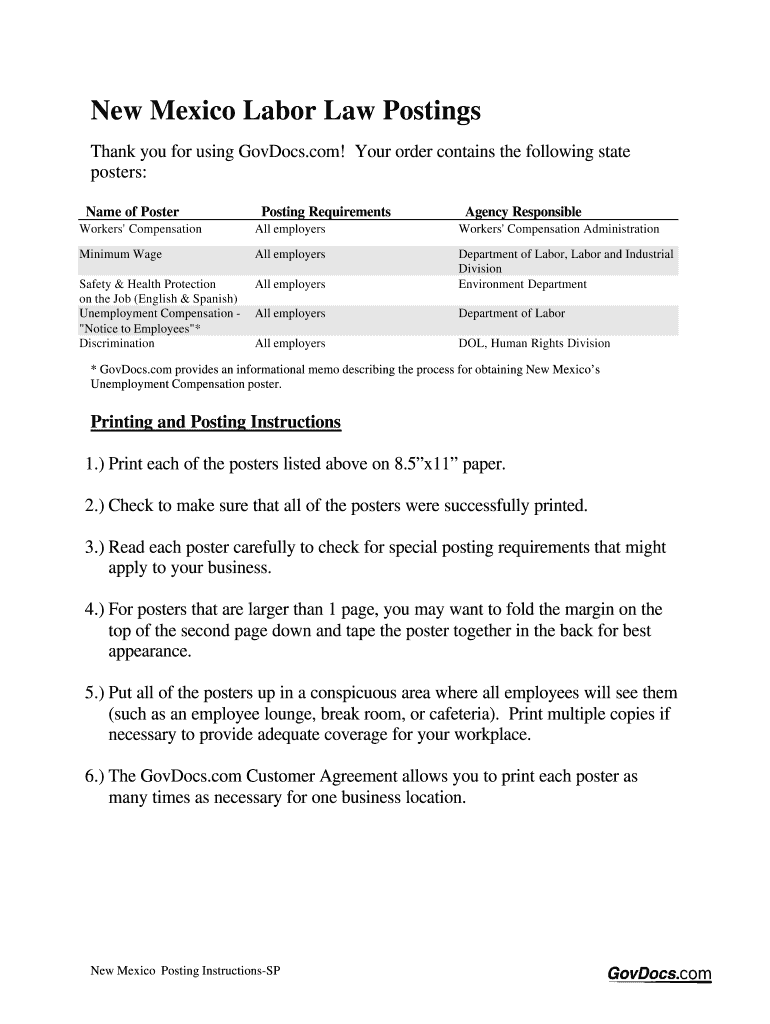 New Mexico Labor Law Postings Thank you for using GovDocs.com! Your order contains the following state posters: Name of Poster Posting Requirements Agency Responsible Workers Compensation All employers