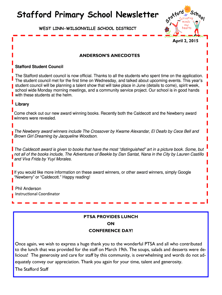 Stafford Primary School Newsletter WEST LINNWILSONVILLE SCHOOL DISTRICT April 2, 2015, ANDERSON ANECDOTES Stafford Student Council The Stafford student council is now official. Thanks to all the students