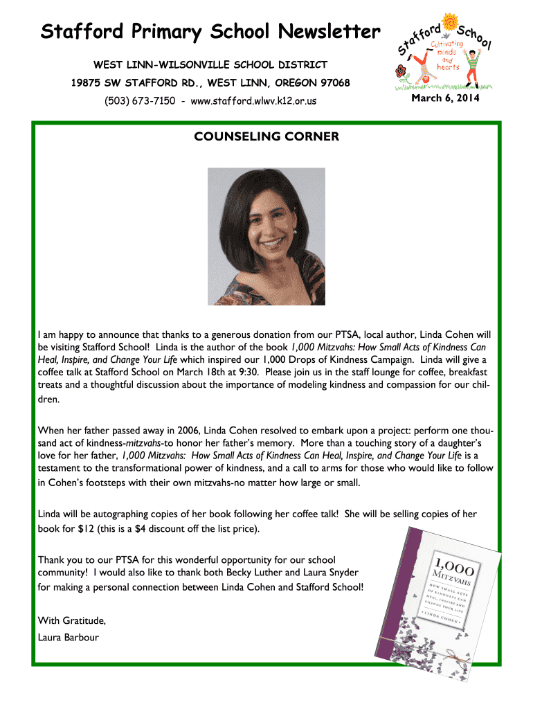 Stafford Primary School Newsletter WEST LINNWILSONVILLE SCHOOL DISTRICT 19875 SW STAFFORD RD., WEST LINN, OREGON 97068 (503) 6737150 www.stafford.wlwv.k12.or.us March 6, 2014, COUNSELING CORNER I