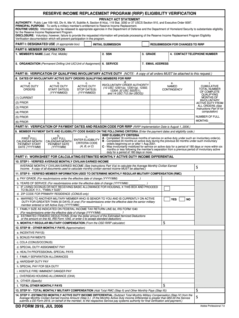 Active duty military personnel who are seeking to verify their entitlement to Reserve Income Replacement benefits can use this form. It requires completion by the member, a service verifying official, and an authorizing official.