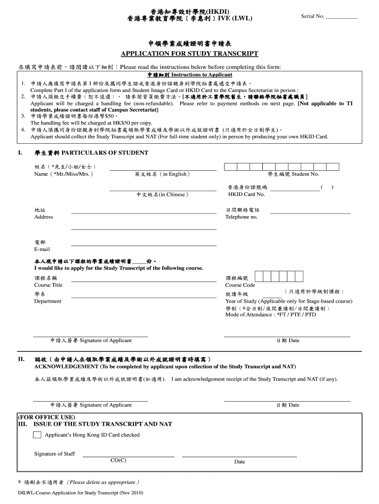 Vow t DILWLCourseApplication for Study Transcript (Nov 2010) Please delete as appropriate Signature of Staff Date CO Applicants Hong Kong ID Card checked III. ISSUE OF THE STUDY TRANSCRIPT AND NAT