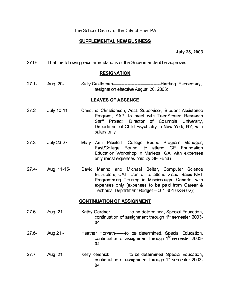 The School District of the City of Erie, PA SUPPLEMENTAL NEW BUSINESS July 23, 2003 27.0 That the following recommendations of the Superintendent be approved: RESIGNATION 27.1 Aug. 20 Sally CastlemanHarding,