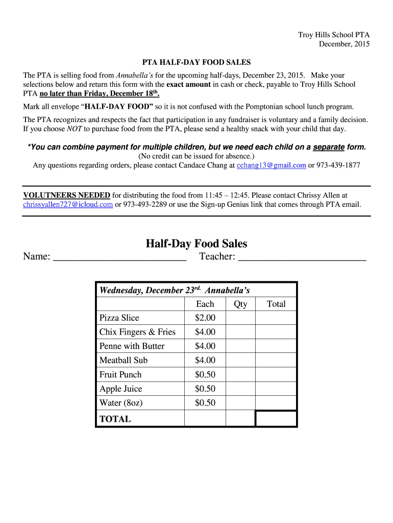 The PTA is selling food from Annabella for the upcoming half days, December 23, 2015. Make your