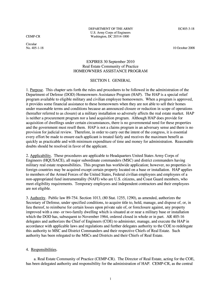 CEM PCR DEPARTMENT OF THE ARMY U.S. Army Corps of Engineers Washington, DC 203141000 Circular No. 405118 EC405318 10 October 2008 EXPIRES 30 September 2010 Real Estate Community of Practice HOMEOWNERS