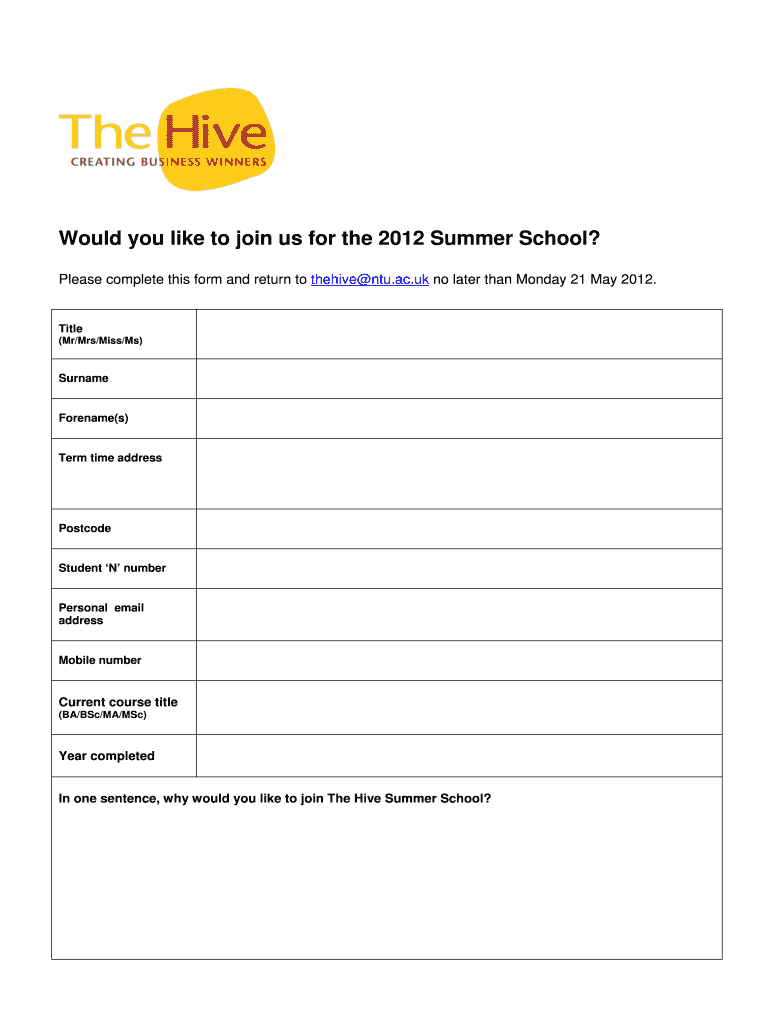 Would you like to join us for the 2012 Summer School? Please complete this form and return to the hive nut.ac.UK no later than Monday 21 May 2012. Title (Mr/Mrs/Miss/Ms) Surname Forename(s) Term time